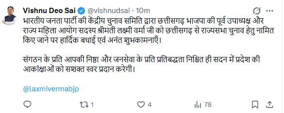लक्ष्मी वर्मा को प्रत्याशी बनाए जाने पर मुख्यमंत्री विष्णुदेव साय ने बधाई और शुभकामनाएं दी है। उन्होंने अपने एक्स हैंडल पर लिखा कि भारतीय जनता पार्टी की केंद्रीय चुनाव समिति द्वारा छत्तीसगढ़ भाजपा की पूर्व उपाध्यक्ष और राज्य महिला आयोग सदस्य श्रीमती लक्ष्मी वर्मा जी को छत्तीसगढ़ से राज्यसभा चुनाव हेतु नामित किए जाने पर हार्दिक बधाई एवं अनंत शुभकामनाएँ। संगठन के प्रति आपकी निष्ठा और जनसेवा के प्रति प्रतिबद्धता निश्चित ही सदन में प्रदेश की आकांक्षाओं को सशक्त स्वर प्रदान करेगी।