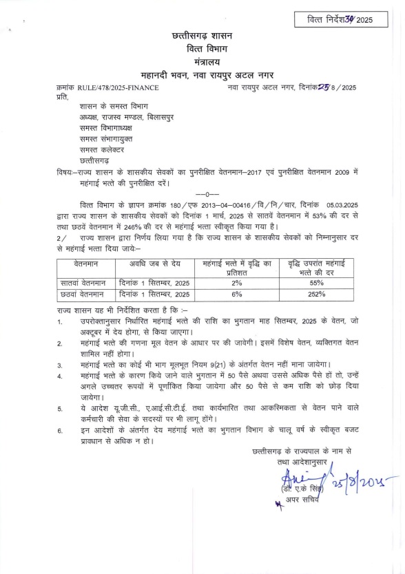Chhattisgarh DA Hike Latest News वित्त विभाग की ओर से जारी आदेश के मुताबिक सातवें वेतनमान में आने वाले कर्मचारियों को अब 1 सितंबर 2025 से 55% DA मिलेगा। वहीं छठवें वेतनमान के कर्मचारियों को 252% DA दिया जाएगा यानी उनके महंगाई भत्ते में 6 प्रतिशत की बढ़ोतरी की गई है। महंगाई भत्ते की नई दरों का लाभ सितंबर 2025 के वेतन से मिलेगा, जो अक्टूबर 2025 में देय होगा।