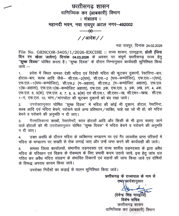 रायपुर। CG Sharab Dukan Band: छत्तीसगढ़ सरकार ने होली पर्व को लेकर बड़ा फैसला लिया है। राज्य में होली के दिन सभी देशी-विदेशी शराब दुकानें बंद रहेंगी। आबकारी विभाग ने इस संबंध में आदेश जारी कर होली को ‘ड्राई डे’ घोषित कर दिया है। जारी आदेश के मुताबिक, होली के दिन प्रदेशभर में संचालित सभी मदिरा दुकानें, बार और संबंधित बिक्री केंद्र पूर्णतः बंद रहेंगे। इस अवधि में शराब की बिक्री, परिवहन और वितरण पर भी प्रतिबंध रहेगा। सरकार का कहना है कि त्योहार के दौरान कानून-व्यवस्था बनाए रखने और शांति पूर्ण माहौल सुनिश्चित करने के उद्देश्य से यह निर्णय लिया गया है। आबकारी विभाग ने जिला प्रशासन और पुलिस विभाग को आदेश के सख्ती से पालन के निर्देश दिए हैं।