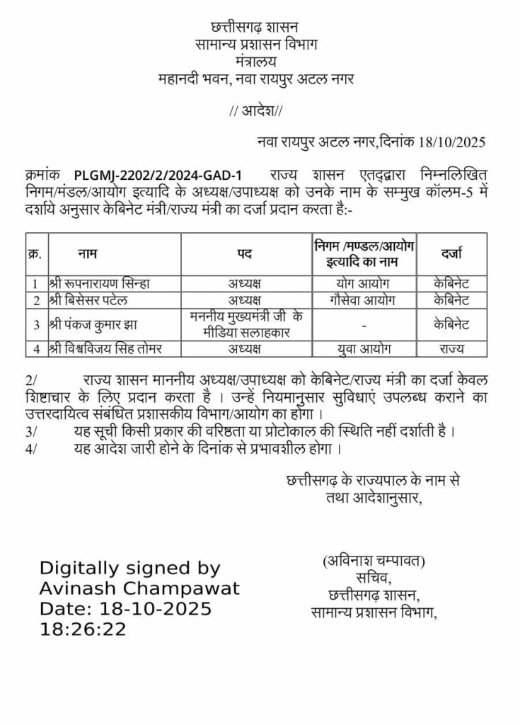 Raipur news: सूची में मुख्यमंत्री के मीडिया सलाहकार पंकज झा के साथ ही योग आयोग अध्यक्ष रूपनारायण सिन्हा को कैबिनेट मंत्री का दर्जा दिया गया है।