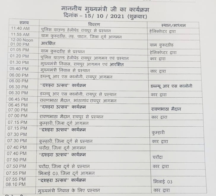 मुख्यमंत्री बघेल शाम 6 बजे रायपुर की डब्ल्यू.आर.एस. कालोनी में आयोजित दशहरा उत्सव में शामिल होंगे। इसके बाद वे 6.45 बजे रावण भाठा मैदान पहुंचेंगे और वहां दशहरा उत्सव में शामिल होंगे। मुख्यमंत्री बघेल रात्रि 7 बजे रावणभाठा मैदान से कुम्हारी जिला दुर्ग के लिए प्रस्थान करेंगे। वे 7.15 बजे कुम्हारी, 7.40 बजे चरौदा और 7.55 बजे भिलाई-03 में आयोजित दशहरा उत्सव में शामिल होंगे।