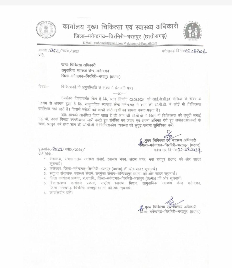 मनेंद्रगढ़ में CMHO ने बीएमओ को भेजा नोटिस, शाम की OPD में डॉक्टरों के नहीं बैठने पर दी चेतावनी, पत्र में IBC24 की खबर का जिक्र