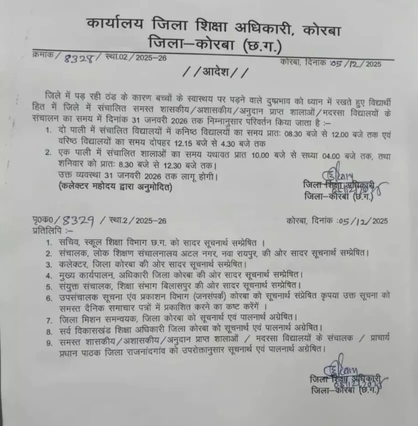 कोरबाः Order to Change Time of All School छत्तीसगढ़ में इन दिनों कड़ाके की ठंड पड़ रही है। आने वाले दो दिनों में प्रदेश के अधिकांश इलाकों में न्यूनतम तापमान में एक से तीन डिग्री सेल्सियस तक की गिरावट देखने को मिल सकती है। मौसम विभाग ने इसे लेकर अलर्ट भी जारी किया है। बढ़ते ठंड को देखते हुए कोरबा जिला प्रशासन ने बड़ा फैसला लिया है। प्रशासन ने जिले के सभी स्कूलों के समय में परिवर्तन कर दिया है। इस संबंध में कलेक्टर के निर्देश के बाद जिला शिक्षा अधिकारी ने आदेश भी जारी कर दिया है।