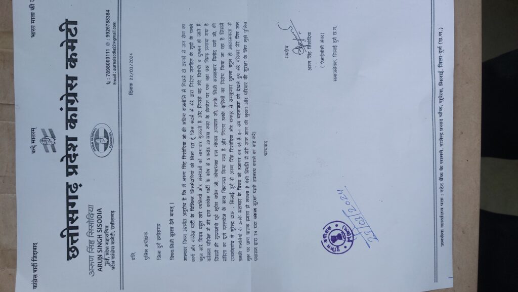 Congress leader security demand : दुर्ग। पार्टी और पार्टी नेताओं पर तमाम आरोप लगाने वाले कांग्रेस नेताओं को अब सुरक्षा की चिंता सताने लगी है। कांग्रेस पार्टी के कोषाध्यक्ष पर पत्र के माध्यम से पैसों के हेराफेरी का आरोप लगाने वाले अरुण सिसोदिया ने अपने और अपने परिवार की सुरक्षा के लिए पुलिस को आवेदन दिया है। वहीं उनकी धर्मपत्नी ने भी सुरक्षा की मांग के साथ साथ कांग्रेस के आला नेताओं को आड़े हाथ लिया है।