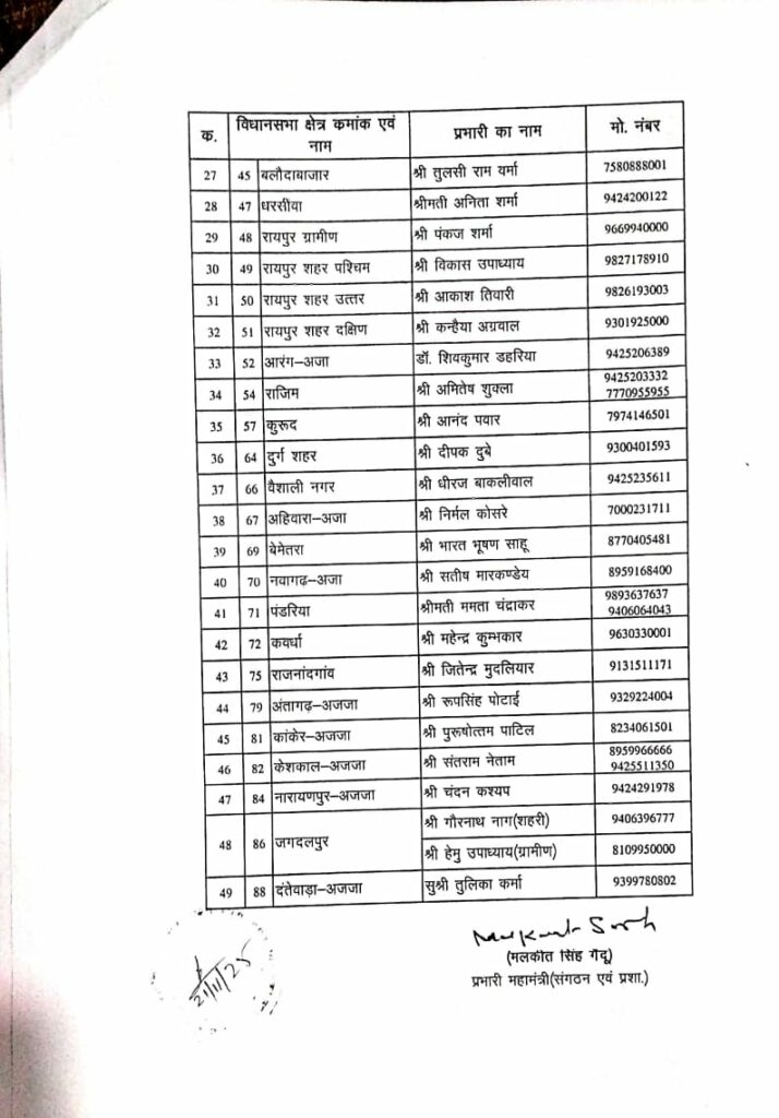 - पंकज शर्मा रायपुर ग्रामीण, विकास उपाध्याय रायपुर पश्चिम विधानसभा प्रभारी