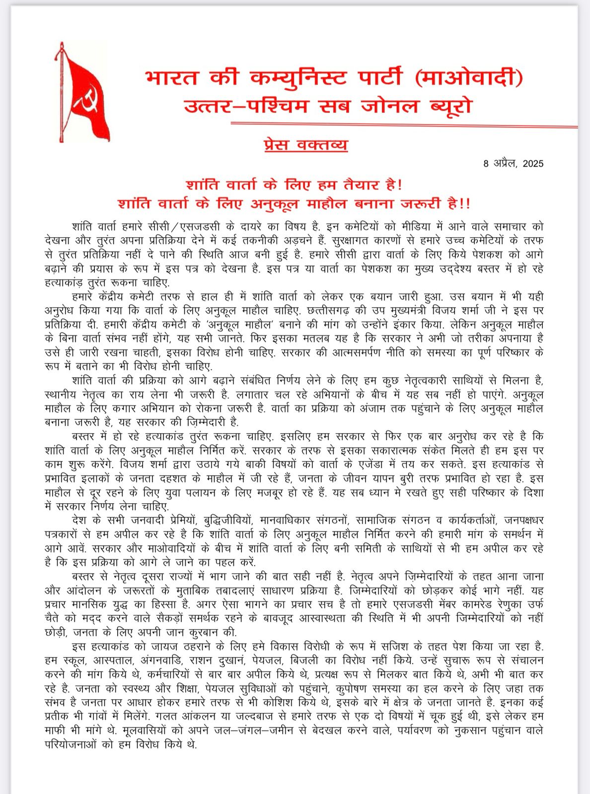 नक्सलियों ने शांति वार्ता के लिए अनुकूल माहौल बनाने की अपील की है और सुरक्षाबलों के ऑपरेशन कगार को रोकने की मांग की है, ताकि वार्ता संभव हो सके।