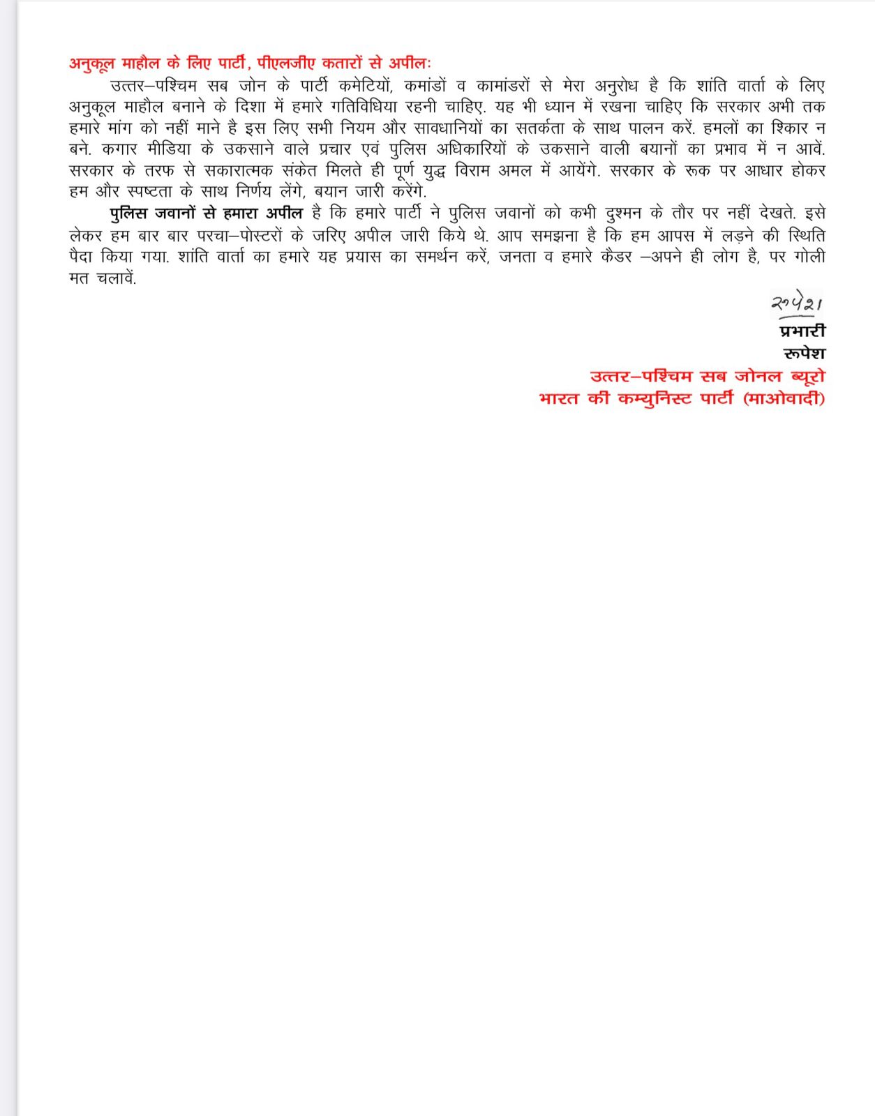 नक्सलियों ने शांति वार्ता के लिए अनुकूल माहौल बनाने की अपील की।