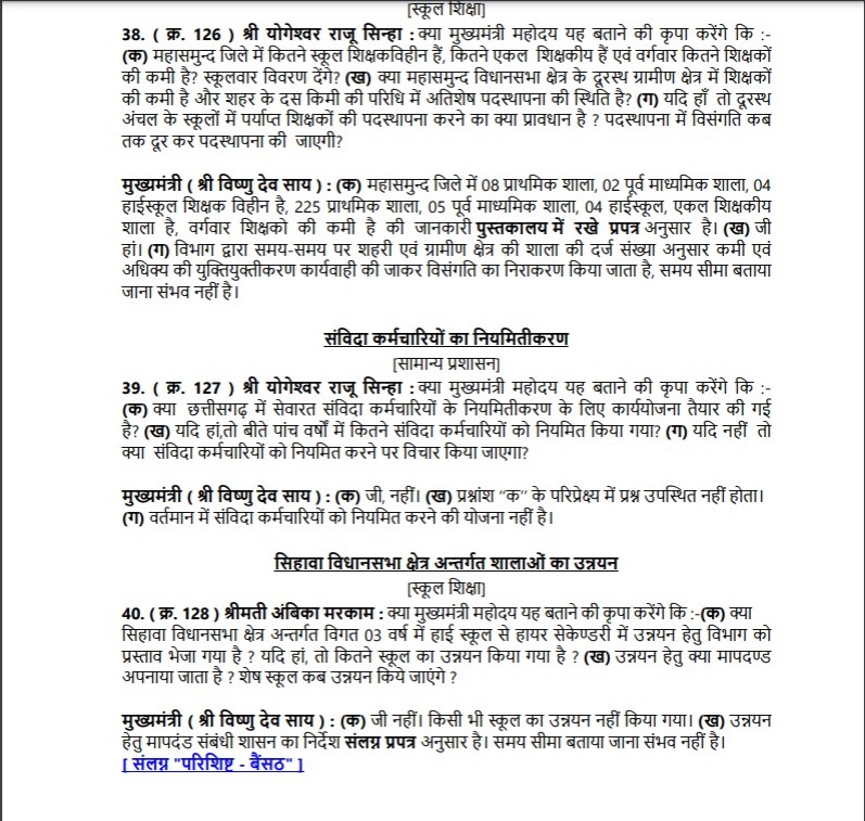 दरअसल, महासमुंद विधानसभा सीट से भाजपा विधायक योगेश्वर राजदू सिन्हा ने विधानसभा के मानसून सत्र के लिए संविदा कर्मचारियों से संबंधित एक प्रश्न लगाया है। उन्होंने पूछा है कि क्या छत्तीसगढ़ में संविदा कर्मचारियों के नियमितीकरण के लिए कोई कार्ययोजना तैयार की गई है? पिछले पांच सालों में कितने संविदा कर्मचारियों को नियमित किया गया है? क्या आगे संविदा कर्मचारियों को नियमित करने पर विचार किया जाएगा? इस प्रश्न के जवाब में सीएम ने कहा है कि संविदा कर्मचारियों के नियमितीकरण के लिए कोई कार्ययोजना नहीं तैयार की गई है। वर्तमान में भी संविदा कर्मचारियों को नियमित करने की कोई योजना नहीं है।