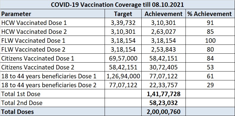 प्रदेश में 45 वर्ष से अधिक के 84 प्रतिशत और 18 से 44 वर्ष आयु वर्ग के 61 प्रतिशत लोगों को कोरोना से बचाव का पहला टीका लगाया जा चुका है। इन दोनों आयु वर्गों के क्रमशः 30 लाख 72 हजार 405 और 22 लाख 33 हजार 757 नागरिक कोरोना वैक्सीन की दोनों खुराक ले चुके हैं।