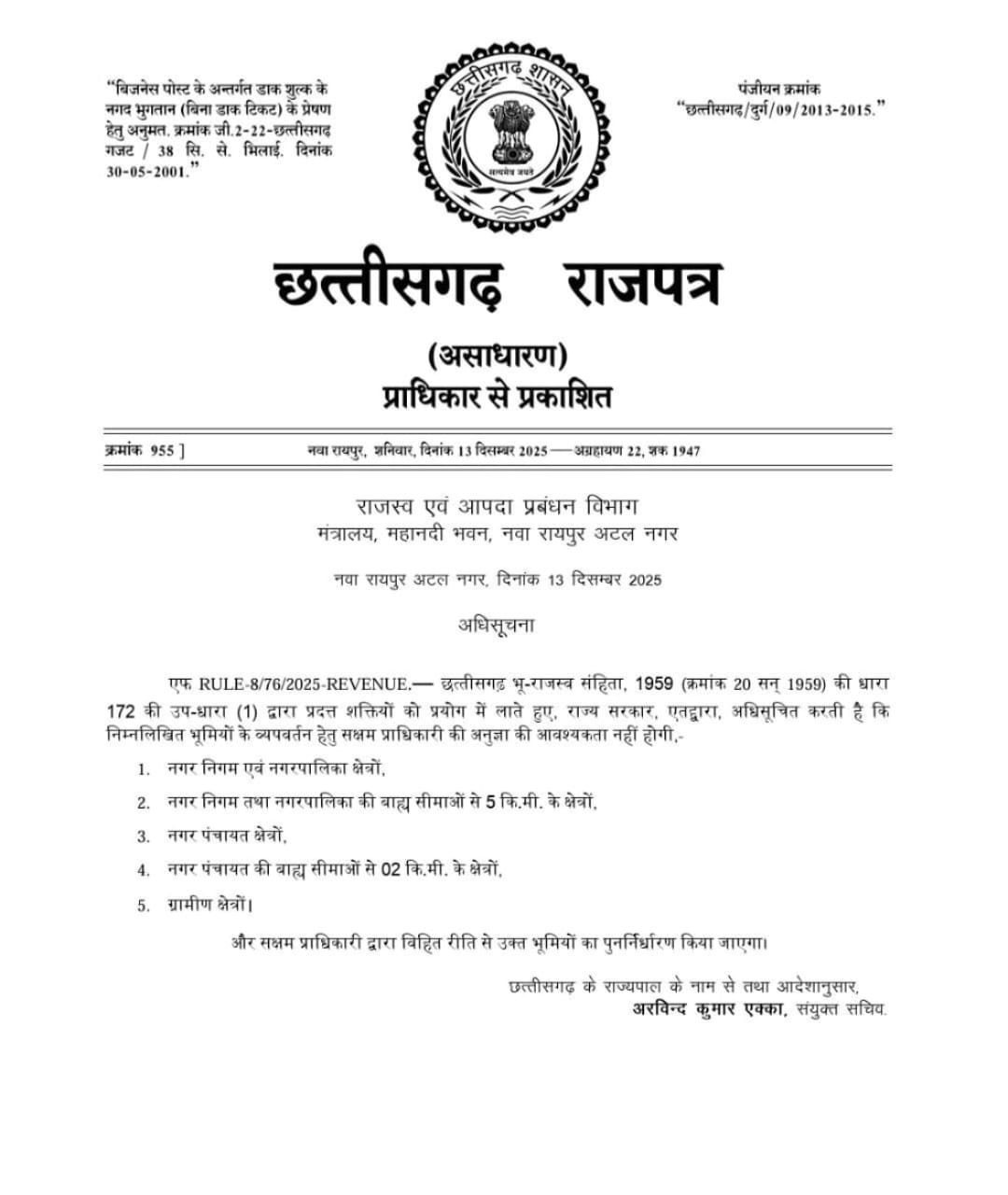 CG Land Diversion News नए नियमों के तहत कृषि भूमि को आवासीय या व्यावसायिक उपयोग में बदलने के लिए अलग से डायवर्सन की अनुमति लेने की जरूरत नहीं होगी। यह व्यवस्था नगर निगम, नगर पालिका, नगर पंचायत के साथ-साथ ग्रामीण क्षेत्रों में भी समान रूप से लागू होगी। सरकार का यह निर्णय छत्तीसगढ़ राजपत्र में प्रकाशित कर दिया गया है। राजपत्र में प्रकाशन के साथ ही यह नियम पूरे प्रदेश में प्रभावी हो गया है। प्रशासनिक स्तर पर इसे लागू करने के निर्देश भी जारी कर दिए गए हैं।