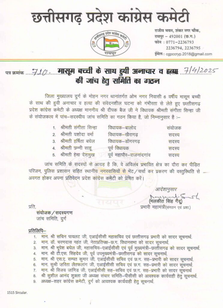 - कांग्रेस ने दुर्ग कांड पर जांच समिति बनाई।
