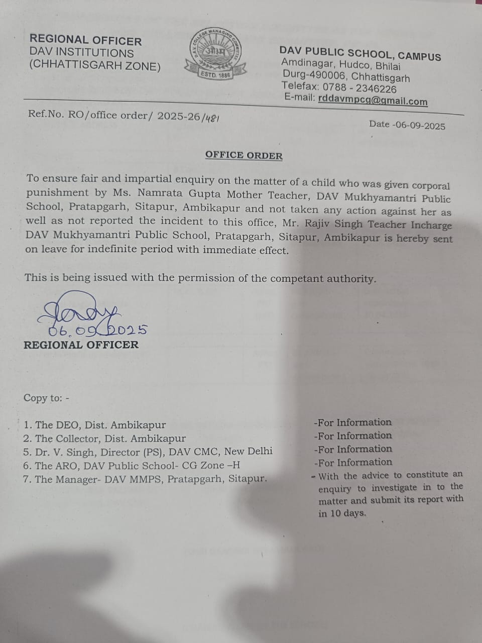 आपको बता दें कि इस पूरे मामलें की खबर आईबीसी 24 न्यूज चैनल ने बड़े ही प्रमुखता से दिखाई थी। जिसके बाद शासन-प्रशासन हरकत में आया और पुलिस ने दोषी शिक्षिका नम्रता गुप्ता के खिलाफ FIR दर्ज कर किया है। वहीं इधर छत्तीसगढ़ जोन के डीएवी प्रबंधन ने शिक्षिका को स्कूल से हटाते हुए उसे इस सेवा से बर्खास्त करने का आदेश भी जारी कर दिया है और डीएवी पब्लिक स्कूल प्रतापगढ़ के प्राचार्य राजीव सिंह को फोर्स लीव यानी मामला दबाने की आशंका पर अनिश्चितकालीन अवकाश पर पर भेजा दिया है।