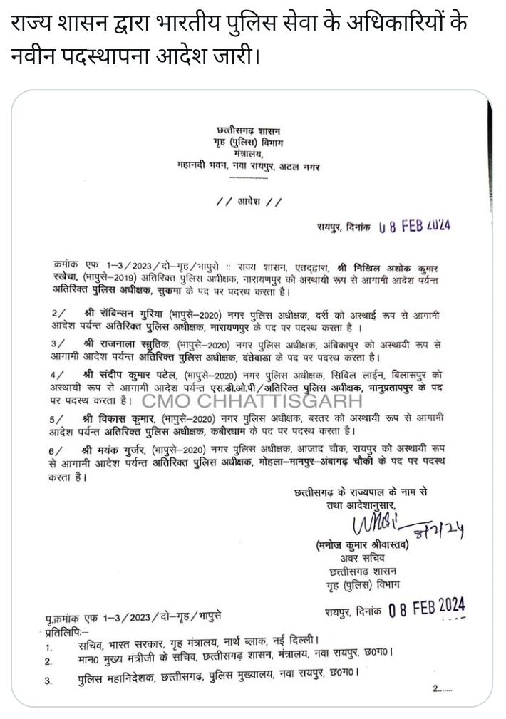 IPS posting : रायपुर। राज्य में चार 4 IPS अधिकारियों को प्रोबेशन पीरियड के बाद ASP की फ्रेश पोस्टिंग मिली है। ये सभी आईपीएस अधिकारी 2019-2020 बैच के हैं। गृह विभाग ने इनकी सूची जारी की है।