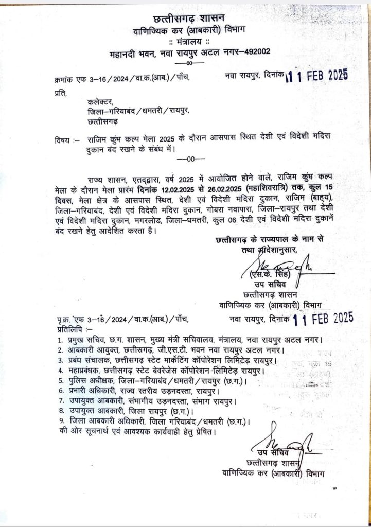 राजिम। Liquor Shops Closed: आगामी 12 फरवरी से राजिम कुंभ कल्प मेला की शुरुआत होने जा रही है, जो 26 फरवरी तक आयोजित किया जाएगा। इस दौरान राजिम समेत रायपुर जिले के 6 शराब की दुकानों को 15 दिनों तक बंद रखने का आदेश आबकारी विभाग ने जारी किया है।