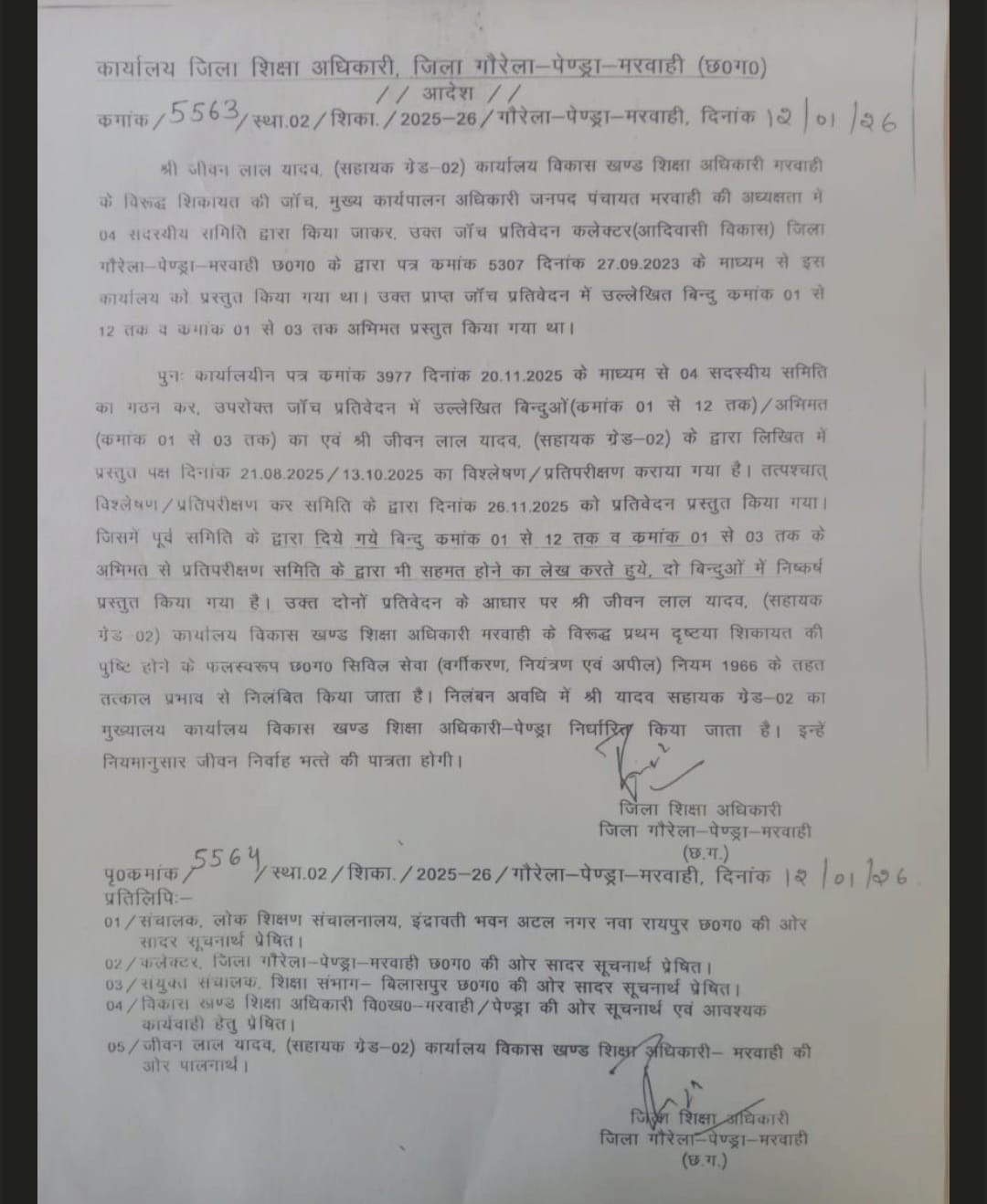 गौरेला–पेंड्रा–मरवाही: Govt Employee Suspension News: गौरेला–पेंड्रा–मरवाही जिले के मरवाही विकास खंड शिक्षा अधिकारी कार्यालय में पदस्थ सहायक ग्रेड-2 जीवन लाल यादव को तत्काल प्रभाव से निलंबित कर दिया गया है। यह कार्रवाई उनके खिलाफ प्राप्त विभिन्न शिकायतों की लंबी जांच प्रक्रिया के बाद की गई है।