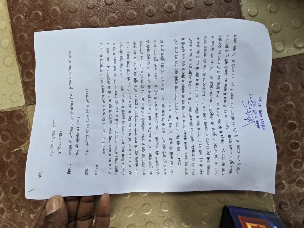 ,बेमेतरा: Bemetara News, बार-बार एक ही परिवार के घर को चार बार तोड़ा गया। गांव के बाहर डेढ़ 2 किलोमीटर में 14 साल से रह रहा है एक परिवार। एक ही परिवार के घर को अतिक्रमण में बसने के कारण सरपंच और अन्य लोगों के द्वारा शिकायत कर तुड़वा दिया गया। पूरा मामला बेमेतरा जिले के मोहतरा (ख )का है। जहां जातीय उत्पीड़न और प्रशासनिक उपेक्षा से टूटे परिवार ने 17 सदस्यों के साथ सामूहिक इच्छा मृत्यु की अनुमति मांगी है। परिवार ने राष्ट्रपति के नाम कलेक्टर को पत्र लिखा है।