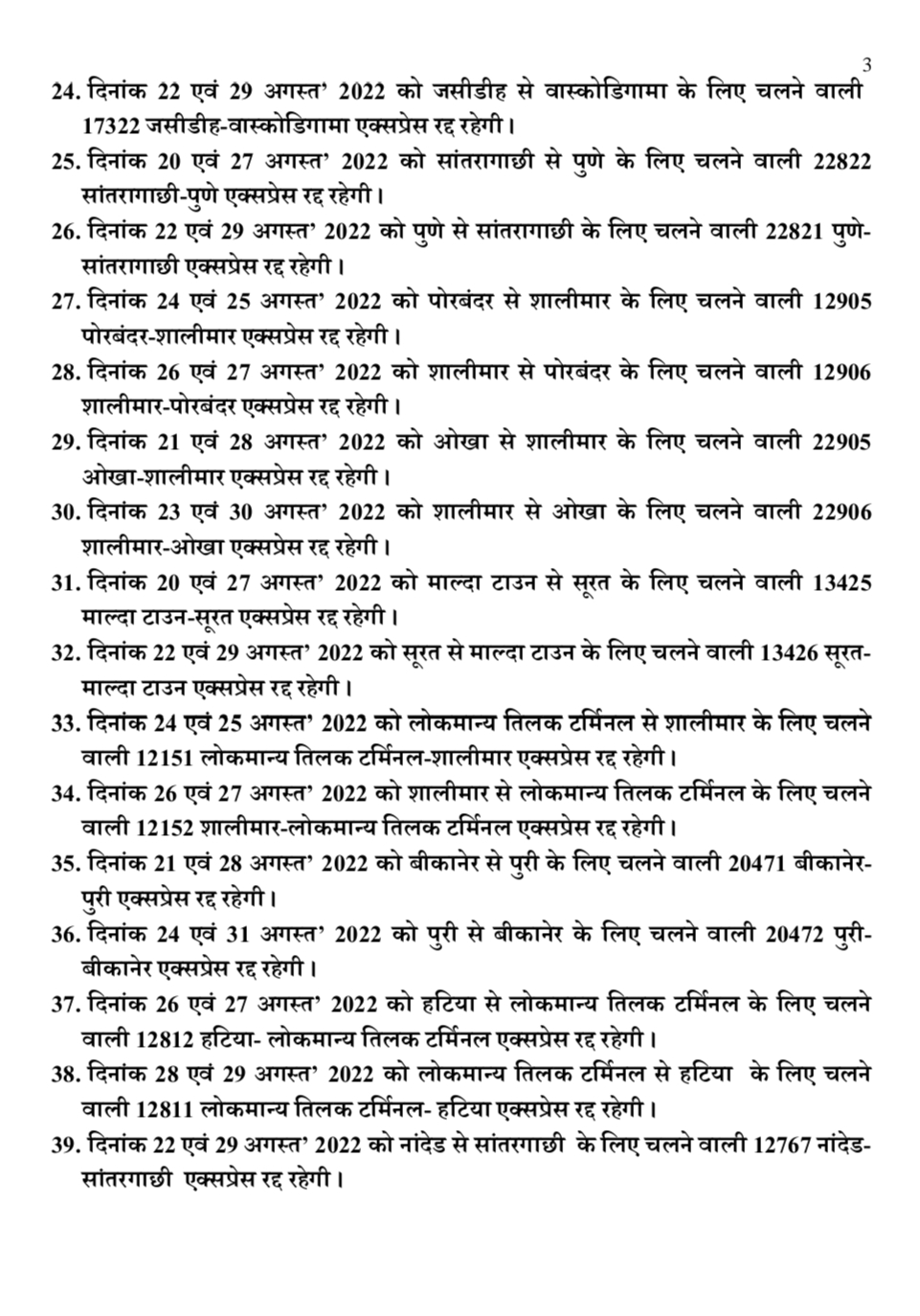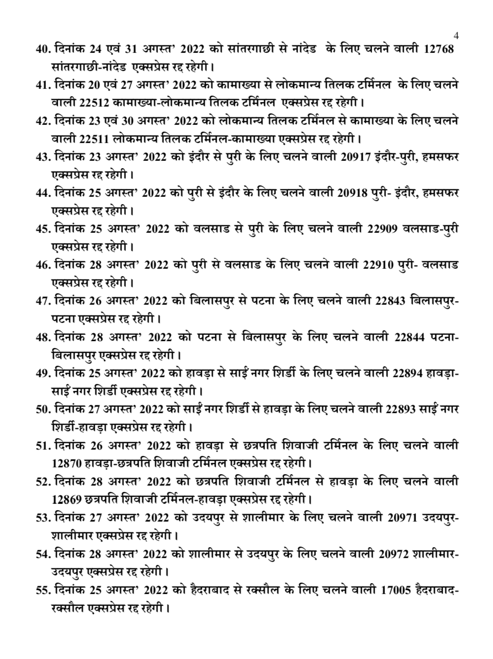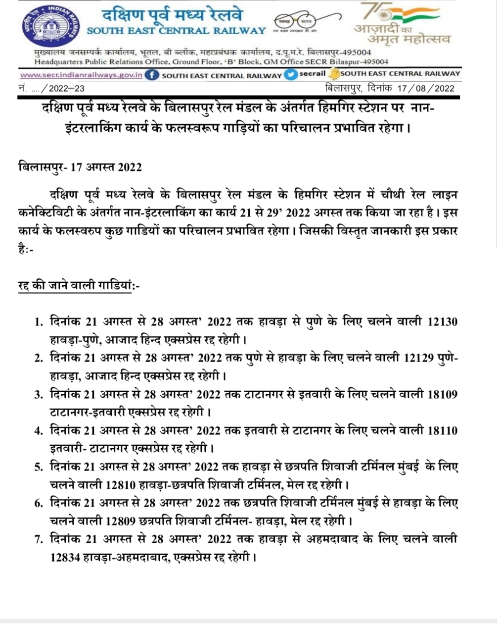 बिलासपुरः Indian Railways Cancelled 62 trains छत्तीसगढ़ के रेलयात्रियों को एक बार फिर बड़ा झटका लगा है। दरअसल, दक्षिण-पूर्व मध्य रेलवे यानी SECR ने एक साथ 62 ट्रेनों को रद्द कर किया है। प्रभावित ट्रेनों में एक्सप्रेस और पैसेंजर मेमू ट्रेनें शामिल है। दरअसल, बिलासपुर रेल मंडल के हिमगिर स्टेशन में काम शुरू किया जाएगा। यही वजह है कि इन ट्रेनों को 21 से 31 अगस्त तक रेलवे ने रद्द कर दिया है।