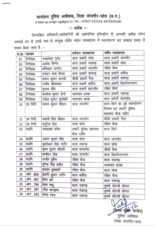 Chhattisgarh Thana Incharge Transfer List: जांजगीर-चाम्पा: नए साल से ठीक पहले जिलेभर में कानून-व्यवस्था को मजबूत करने और पुलिस अधिकारियों में अनुशासन कायम करने के मकसद से जिले के एसपी विजय कुमार ने सात थानों के प्रभारी समेत 25 पुलिस के अधिकारी और कर्मचारियों का अलग-अलग थानों और शाखाओं में तबादला कर दिया है। आप भी देखने पूरी लिस्ट