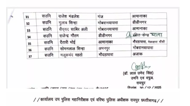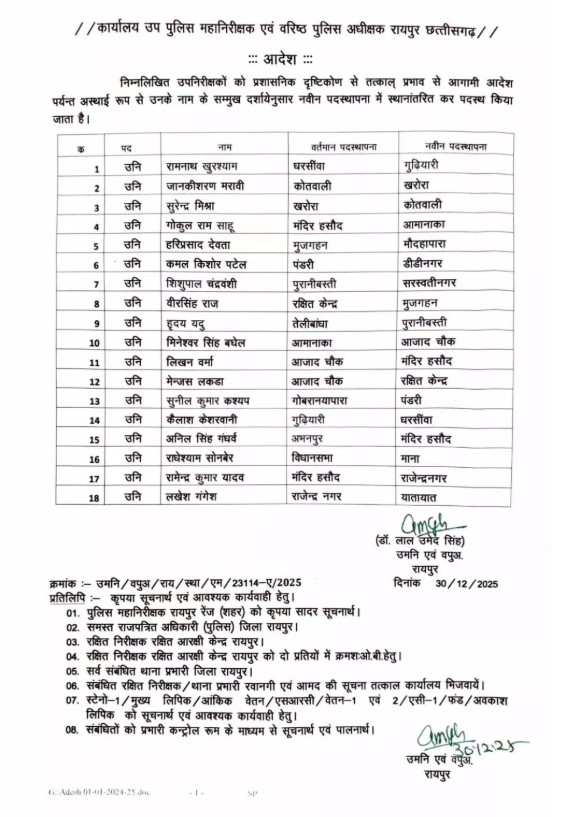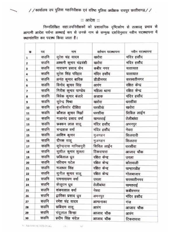 तबादले और नवीन पदस्थापना को लेकर कार्यालय उप पुलिस महानिरीक्षक एवं वरिष्ठ पुलिस अधीक्षक रायपुर द्वारा अधिसूचना जारी कर दी गयी है। जिसके अनुसार, अलग-अलग थानों और इकाइयों में पदस्थ निरीक्षक, एसआई और एएसआई का तबादला गया हुआ है. 4 निरीक्षक, 18 उपनिरीक्षक, 37 सहायक उपनिरीक्षक का तबादला हुआ है।