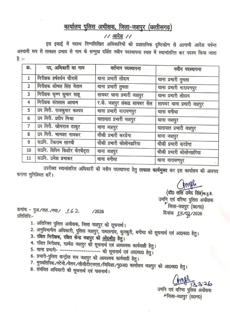 Chhattisgarh Police Transfer News: जशपुर: जिले की कानून-व्यवस्था को मजबूत करने और पुलिसकर्मियों म अनुशासन कायम करने के मकसद से जशपुर जिले के पुलिस कप्तान और डीआईजी डॉ लाल उमेद सिंह की अनुशंसा पर पुलिस महकमें में बड़ा फेरबदल किया है।