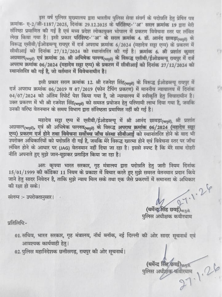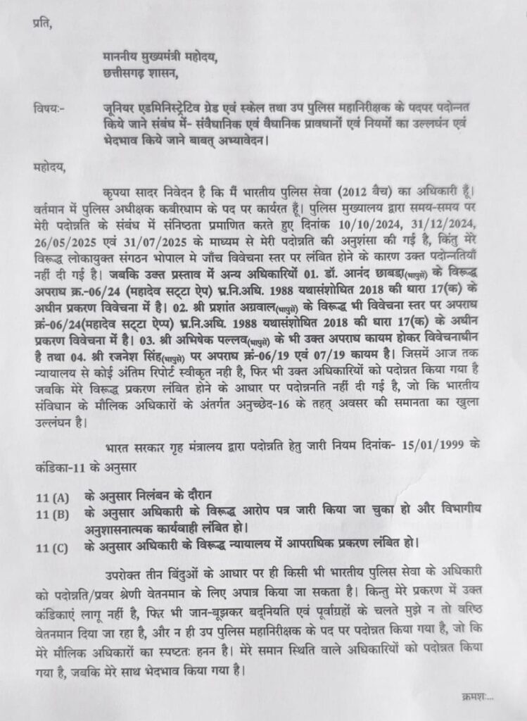 छवई ने इसे भारतीय संविधान के अनुच्छेद-16 के तहत समान अवसर के अधिकार का खुला उल्लंघन बताया है। पत्र में यह भी कहा गया है कि समान परिस्थिति वाले अधिकारियों को पदोन्नत किया गया, जबकि उनके साथ भेदभाव किया गया, जिससे उनका मनोबल आहत हुआ है। (Kawardha SP letter CM Vishnu deo sai) अधिकारी के इस पत्र ने पुलिस विभाग में पदोन्नति प्रक्रिया की पारदर्शिता और निष्पक्षता पर कई सवाल खड़े कर दिए हैं।