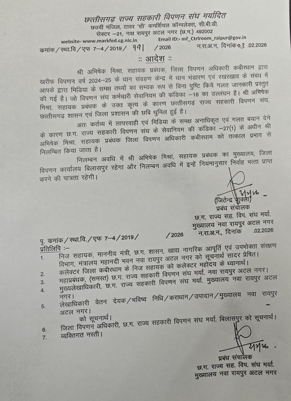 Kawardha Dhan Ghotala: निलंबन का आदेश रायपुर मार्कफेड के प्रबंध संचालक द्वारा जारी किया गया है। दरअसल, वर्ष 2024-25 में कवर्धा जिले में लगभग 7 करोड़ रुपये के धान शॉर्टेज का गंभीर मामला सामने आया था। इस मामले में डीएमओ अभिषेक मिश्रा ने मीडिया के सामने कहा था कि धान चूहों, दीमकों और कीटों द्वारा खाया गया।