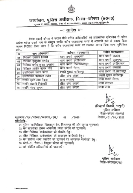 Police Inspector Transfer List Today: कोरबा। नए साल के पहले दिन जिला पुलिस अधीक्षक IPS सिद्धार्थ तिवारी ने जिले की पुलिसिंग और कानून-व्यवस्था में कसावट लाने के मकसद से जिले के चार थानों एवं चौकियों में प्रभारियों के तबादले किए हैं। पुलिस अधीक्षक के जिला मुख्यालय ने इस संबंध में आदेश के साथ तबादले की सूची जारी कर दी है।