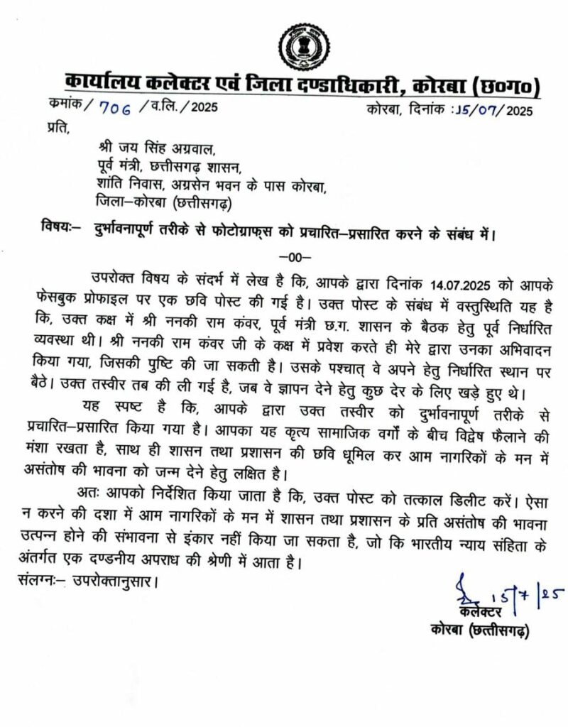 कोरबा: Korba news, कोरबा कलेक्टर ने कांग्रेस नेता और पूर्व मंत्री जय सिंह अग्रवाल को नोटिस भेजा है। यह नोटिस पूर्व मंत्री जय सिंह अग्रवाल के सोशल मीडिया में गिए गए एक पोस्ट को लेकर भेजा गया है। इसके साथ ही कलेक्टर ने पूर्व मंत्री को तत्काल पोस्ट डिलीट करने के लिए कहा है।