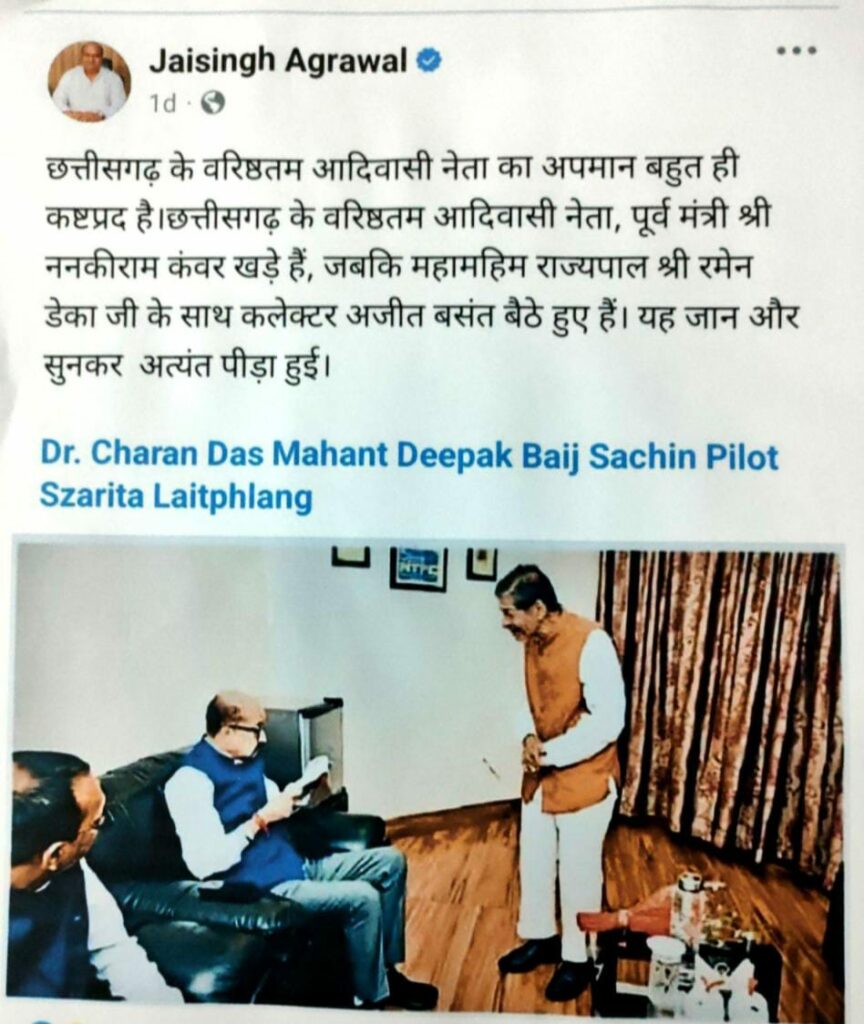 दरअसल, जयसिंह अग्रवाल ने 13 जुलाई को सोशल मीडिया एक्स पर अपने हैंडल से इस तस्वीर को पोस्ट किया है, साथ ही लिखा है कि ‘छत्तीसगढ़ के वरिष्ठतम आदिवासी नेता का अपमान बहुत ही कष्टप्रद है।छत्तीसगढ़ के वरिष्ठतम आदिवासी नेता, पूर्व मंत्री श्री ननकीराम कंवर खड़े हैं, जबकि महामहिम राज्यपाल श्री रमेन डेका जी के साथ कलेक्टर अजीत बसंत बैठे हुए हैं। यह जान और सुनकर अत्यंत पीड़ा हुई।’
