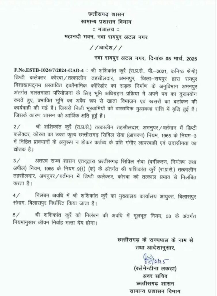 Raipur-Vishakhapatanam Land Scam: रायपुर-विशाखापट्टनम सिक्स लेन ग्रीन कारिडोर के बहुचर्चित मुआवजा घोटाले में राज्य सरकार ने आज डिप्टी कलेक्टर शशिकांत कुर्रे को सस्पेंड कर दिया। शशिकांत मुआवजा घोटाले के दौरान अभनपुर के तहसीलदार रहे।