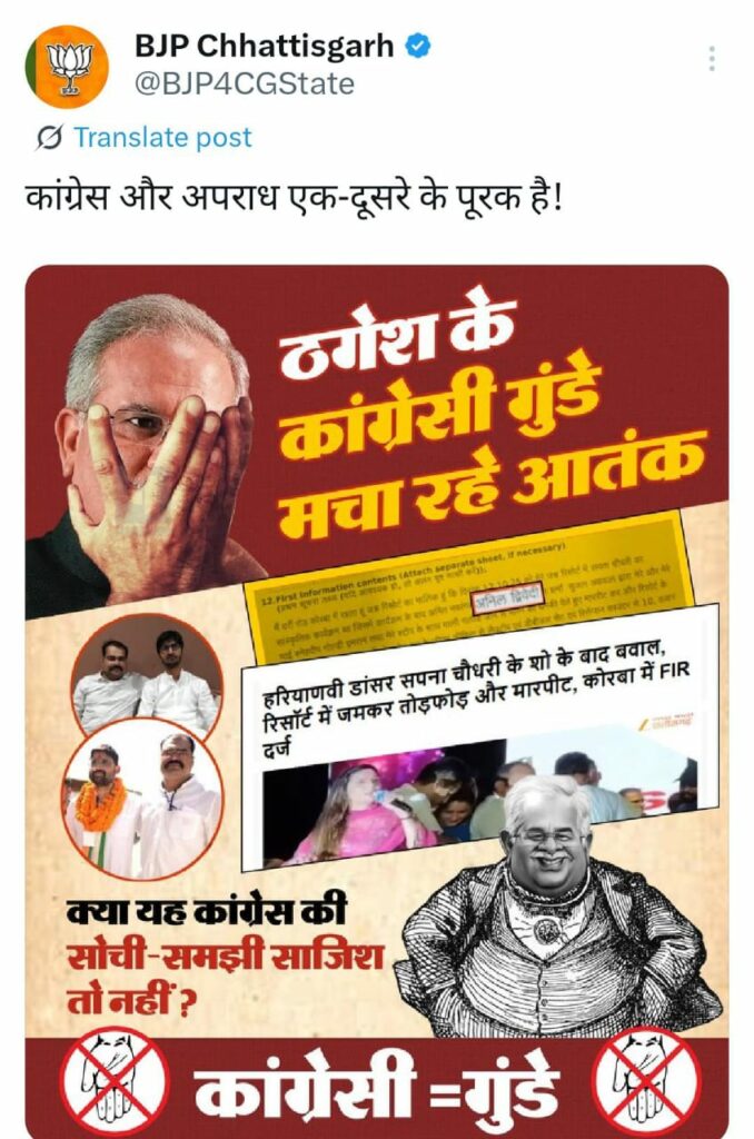 Sapna Chaudhary in Korba: 12 अक्टूबर को एक रिजॉर्ट में हरियाणवी डांसर सपना चौधरी के कार्यक्रम में हंगामा करने वाले कांग्रेसी बताए जा रहे हैं। इसे लेकर भाजपा ने अपने आधिकारिक एक्स हैंडल पर पोस्ट कर कांग्रेस पार्टी पर निशाना साधा है।