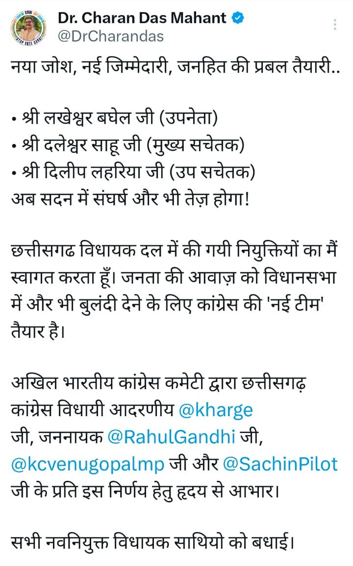 बता दें कि छत्तीसगढ़ विधानसभा में लंबे समय से उपनेता प्रतिपक्ष का पद खाली था। अब आखिरकार पार्टी ने इनकी नियुक्ति कर दी है। लखेश्वर बघेल बस्तर में एक बड़े कांग्रेस नेता माने जाते हैं। बस्तर विधानसभा से वे लगातार तीसरी बार विधायक हैं। उनकी नियुक्ति पर नेता प्रतिपक्ष चरणदास महंत ने कहा कि छत्तीसगढ़ विधायक दल में नियुक्तियों का स्वागत करता हूं। विधानसभा में जनता की आवाज को और बुलंदी देने नई टीम तैयार है। उन्होंने कांग्रेस अध्यक्ष मल्लिकार्जुन खड़गे, राहुल गांधी और केसी वेणुगोपाल का आभार जताया है।