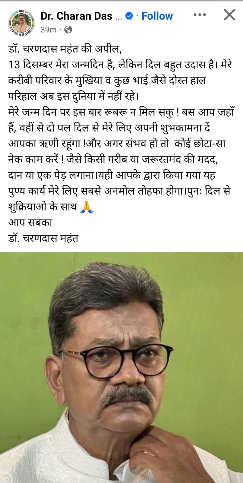 रायपुरः Dr. Charandas Mahant Birthday: छत्तीसगढ़ के नेता प्रतिपक्ष डॉ. चरणदास महंत हर साल 13 दिसंबर को अपना जन्मदिन मनाते हैं, लेकिन इस बार उन्होंने अपना जन्मदिवस नहीं मनाने का फैसला लिया है। इसकी जानकारी उन्होंने खुद अपने सोशल मीडिया अकाउंट पर दी है। उन्होंने लिखा है 13 दिसम्बर मेरा जन्मदिन है, लेकिन दिल बहुत उदास है। मेरे करीबी परिवार के मुखिया व कुछ भाई जैसे दोस्त हाल परिहाल अब इस दुनिया में नहीं रहे। मेरे जन्म दिन पर इस बार रूबरू न मिल सकूं। बस आप जहाँ हैं, वहीं से दो पल दिल से मेरे लिए अपनी शुभकामना दें आपका ऋणी रहूंगा और अगर संभव हो तो कोई छोटा-सा नेक काम करें। जैसे किसी गरीब या जरूरतमंद की मदद, दान या एक पेड़ लगाना। यही आपके द्वारा किया गया यह पुण्य कार्य मेरे लिए सबसे अनमोल तोहफा होगा।
