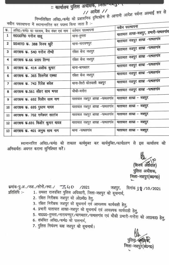 पत्थलगांवः जशपुर जिले के पत्थलगांव में हुए हादसे के बाद पुलिस विभाग में बड़ा फेरबदल किया गया है। जिले के 6 TI और 50 पुलिस कर्मियों का तबादला किया गया है। इनमें पत्थलगांव थाने से 20 से ज्यादा पुलिसकर्मी शामिल है। इस संबंध में एसपी ने आदेश जारी कर दिया है।