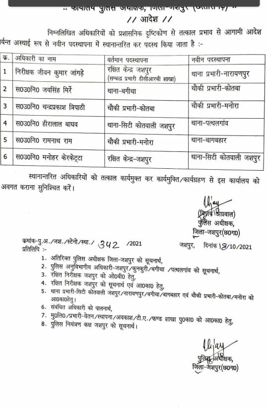 पत्थलगांव कांड के बाद पुलिस विभाग में बड़ा फेरबदल, बदले गए 6 थानों के प्रभारी, 50 पुलिसकर्मियों का भी तबादला