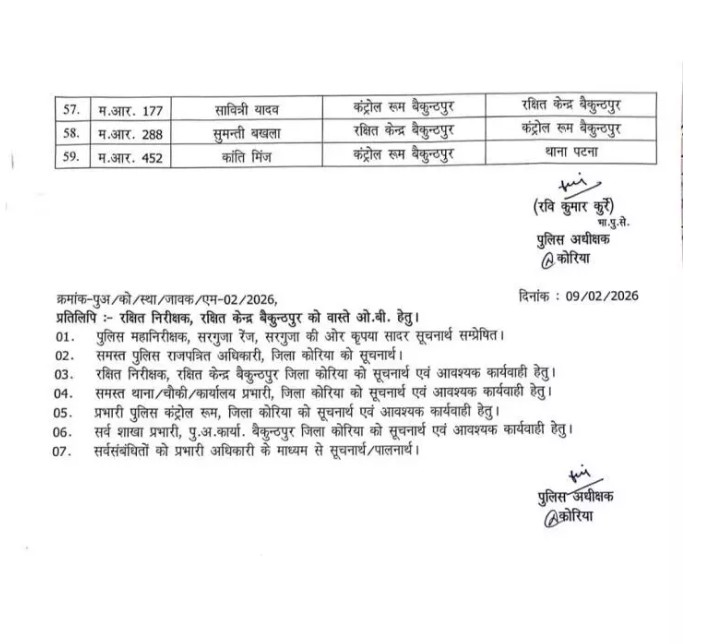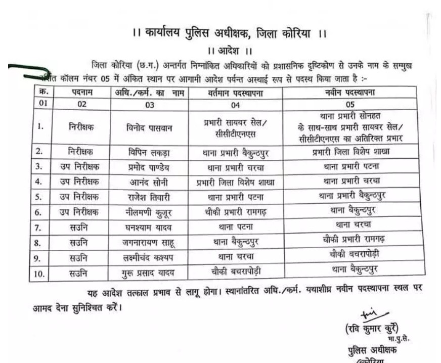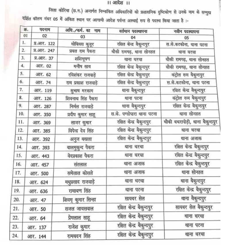 Chhattisgarh Thana Incharge Transfer List: मनेन्द्रगढ़-चिरमिरी-भरतपुर में पुलिस विभाग का बड़ा तबादला आदेश, 7 थाना प्रभारी सहित 69 पुलिसकर्मी स्थानांतरित।