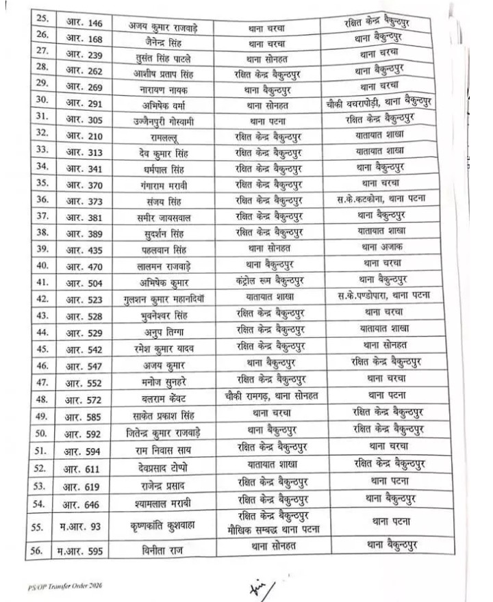 जारी आदेश के तहत करीब सात थाना प्रभारियों का तबादला किया गया है। इस सूची में सब-इंस्पेक्टर (एसआई) और असिस्टेंट सब-इंस्पेक्टर (एएसआई) स्तर के अधिकारी भी शामिल हैं। इसके अलावा एसपी कार्यालय ने तीन प्रधान आरक्षकों और तीन महिला आरक्षकों सहित कुल 69 पुलिसकर्मियों और अधिकारियों के तबादले किए हैं। पूरी तबादला सूची नीचे देखें