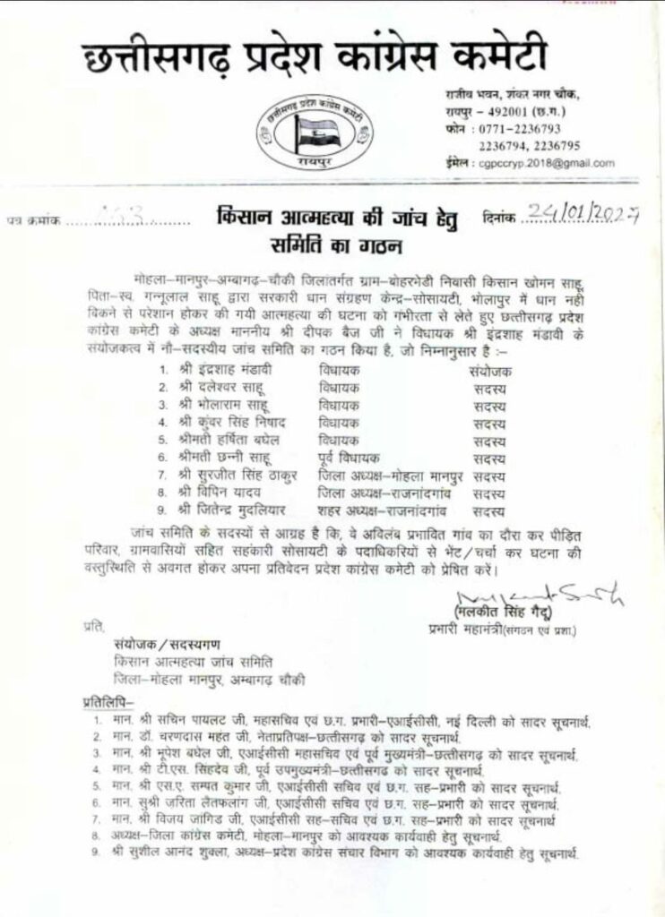 Manpur Kisan Suicide News : छत्तीसगढ़ प्रदेश कांग्रेस कमेटी ने मोहला-मानपुर-अम्बागढ़ चौकी के गांव बोहरनेडी के एक किसान की आत्महत्या की हाल की घटना को गंभीरता से लेते हुए एक उच्च-स्तरीय जांच समिति के गठन की घोषणा की है।