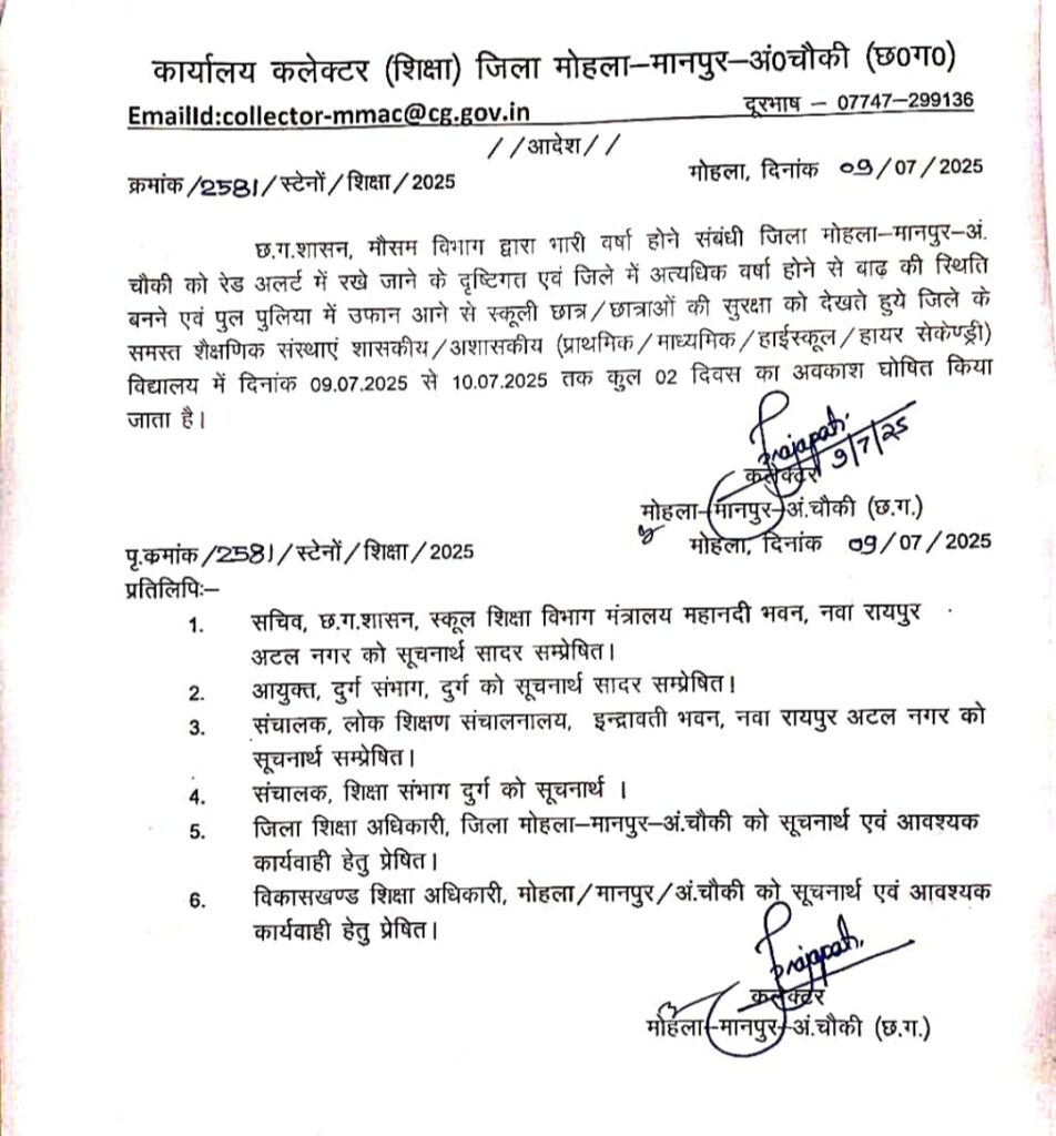 मोहला-मानपुर-अंबागढ़ चौकी: School Closed in Chhattisgarh: जिले में लगातार हो रही भारी बारिश के चलते जनजीवन बुरी तरह प्रभावित हो गया है। मौसम विभाग द्वारा जिले में रेड अलर्ट जारी किया गया है जिसे देखते हुए जिला प्रशासन ने एहतियातन एक अहम निर्णय लिया है। स्कूली बच्चों की सुरक्षा को प्राथमिकता देते हुए प्रशासन ने जिले के सभी शासकीय एवं अशासकीय शिक्षण संस्थानों में 09 एवं 10 जुलाई 2025 को अवकाश घोषित किया है।