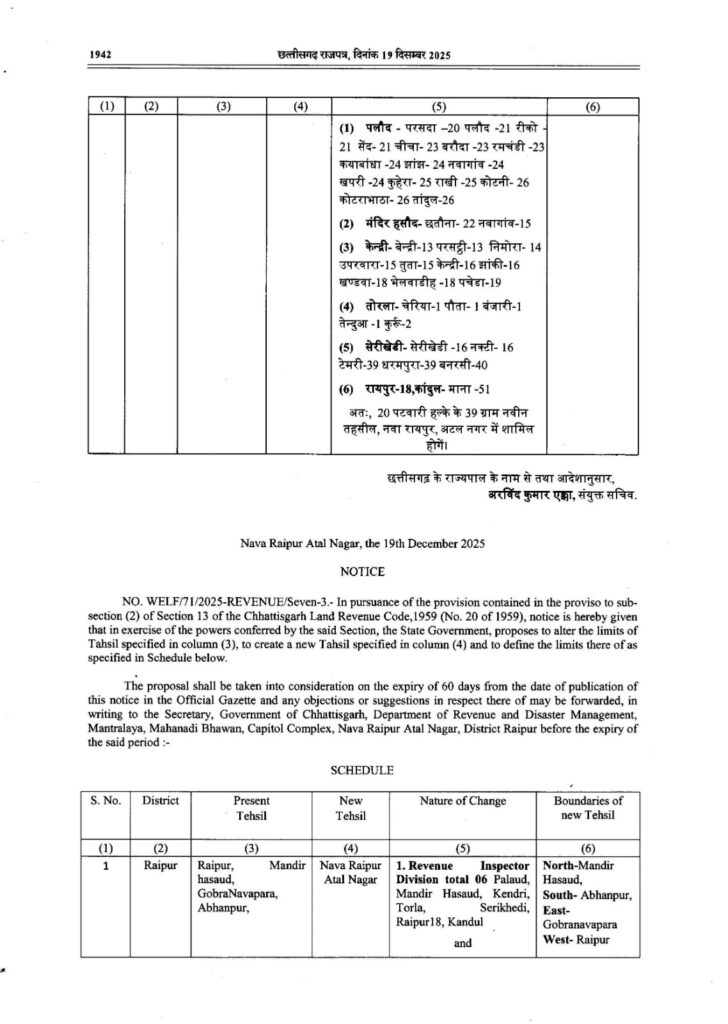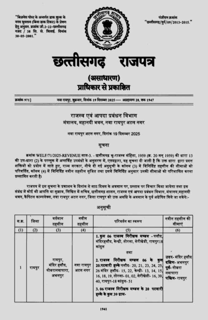 जारी अधिसूचना के अनुसार राज्य सरकार ने रायपुर जिले में एक नई तहसील गठित करने और उसकी सीमाएं निर्धारित करने का प्रस्ताव रखा है।