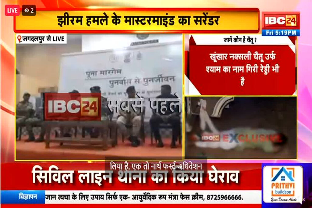 Naxalites Surrender in CG जानकारी के अनुसार, सभी ने आईजी पी. सुंदरराज और एसपी शलभ कुमार सिन्हा के सामने आत्मसमर्पण किया है। बता दें, 2013 में हुए झीरम घाटी हमले में कांग्रेस के बड़े नेताओं समेत 30 लोगों की मौत हो गई थी। उसी कुख्यात हमले का मास्टरमाइंड चैतू को माना जाता है। लंबे समय से दरभा डिवीजन का इंचार्ज रहा चैतू ने अब हिंसा की राह को छोड़ कर मुख्यधारा में लौटने का फैसला लिया।
