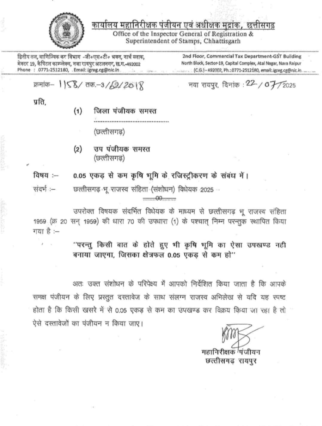 रायपुरः Chhattisgarh News छत्तीसगढ़ में अब 5 डिसमिल से कम आकार की कृषि भूमि की खरीदी-बिक्री करने पर अब रजिस्ट्री नहीं होगी। राज्य सरकार ने इस तरह की भूमि के रजिस्ट्री पर रोक लगा दी है। इस संबंध में महानिरीक्षक (पंजीयन) ने सभी जिला पंजीयकों को पत्र लिखा हैं। बीतें दिनों छत्तीसगढ़ विधानसभा में ‘छत्तीसगढ़ भू राजस्व संहिता (संशोधन) विधेयक-2025’ लाया गया था, जिसमें जमीनों की खरीदी और बिक्री को लेकर कई तरह के प्रावधान किए गए थे। इसमें 5 डिसमिल से कम आकार की कृषि भूमि की रजिस्ट्री नहीं करने की बात भी शामिल थी। अब इस नियम के राजपत्र में प्रकाशन के साथ ही सभी जिला पंजीयकों को आदेश जारी किया गया है।
