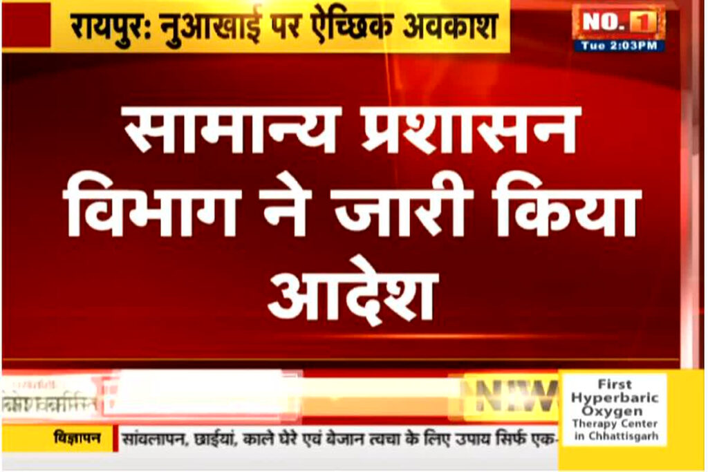 रायपुर। CG News गणेश चतुर्थी के दूसरे दिन नुआखाई का त्योहार मनाया जाता है। इस अवसर पर प्रदेश सरकार ने कल यानी 22 सितंबर को ऐच्छिक अवकाश घोषित कर दी है। सामान्य प्रशासन ने इस संबंध में आदेश जारी किया है।