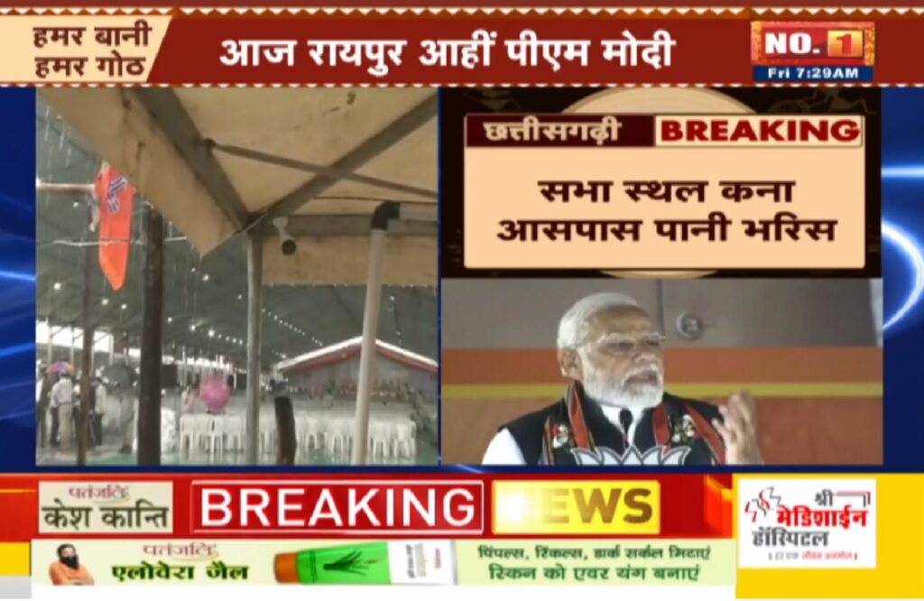रायपुर। PM Modi In Raipur प्रधानमंत्री नरेद्र मोदी आज रायपुर दौरे पर रहेंगे। पीएम आज 10 परियोजनाओं का लोकार्पण करेंगे। लेकिन पीएम मोदी के दौरे से पहले राजधानी रायपुर समेत कई इलाकों में झमाझम बारिश हो रही है। वहीं बारिश की वजह से पीएम मोदी की सभा स्थल के आसपास पानी भर गया है।