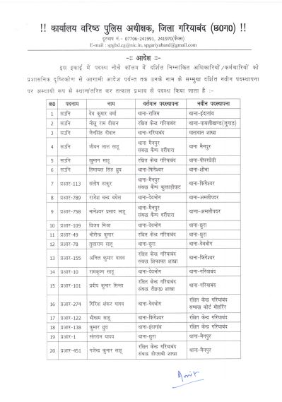 police officers transferred : गरियाबंद पुलिस विभाग में आज बड़ा उलटफेर देखने को मिला है। पुलिस विभाग में बड़ी सर्जरी की गई है। 94 पुलिस....