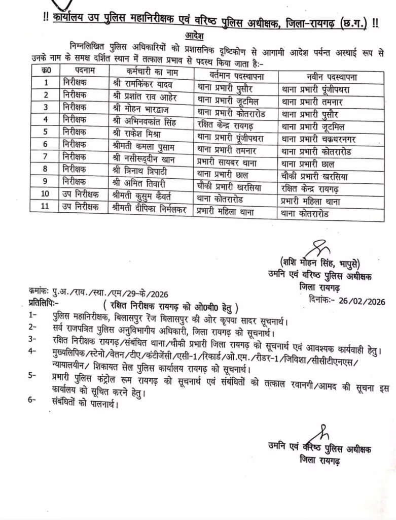 - रायगढ़ में 11 प्रभारियों का ट्रांसफर