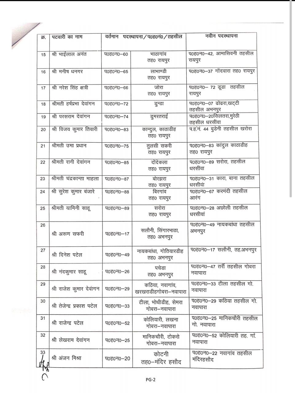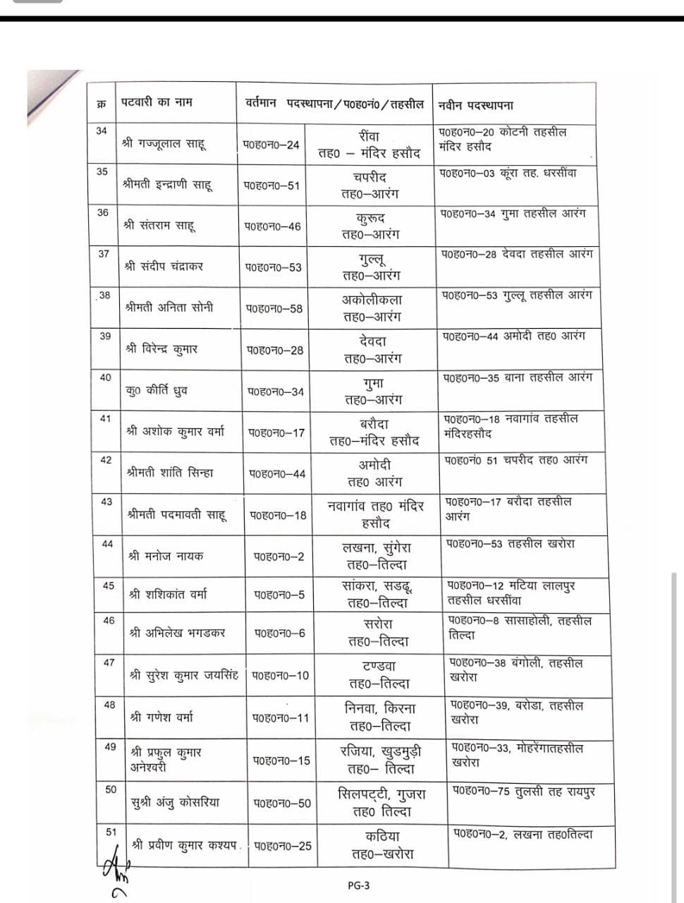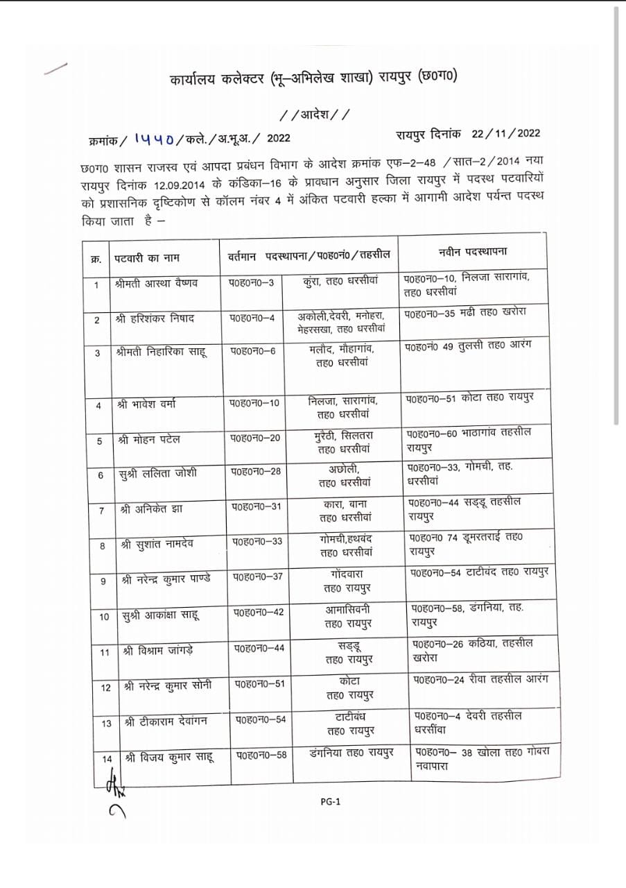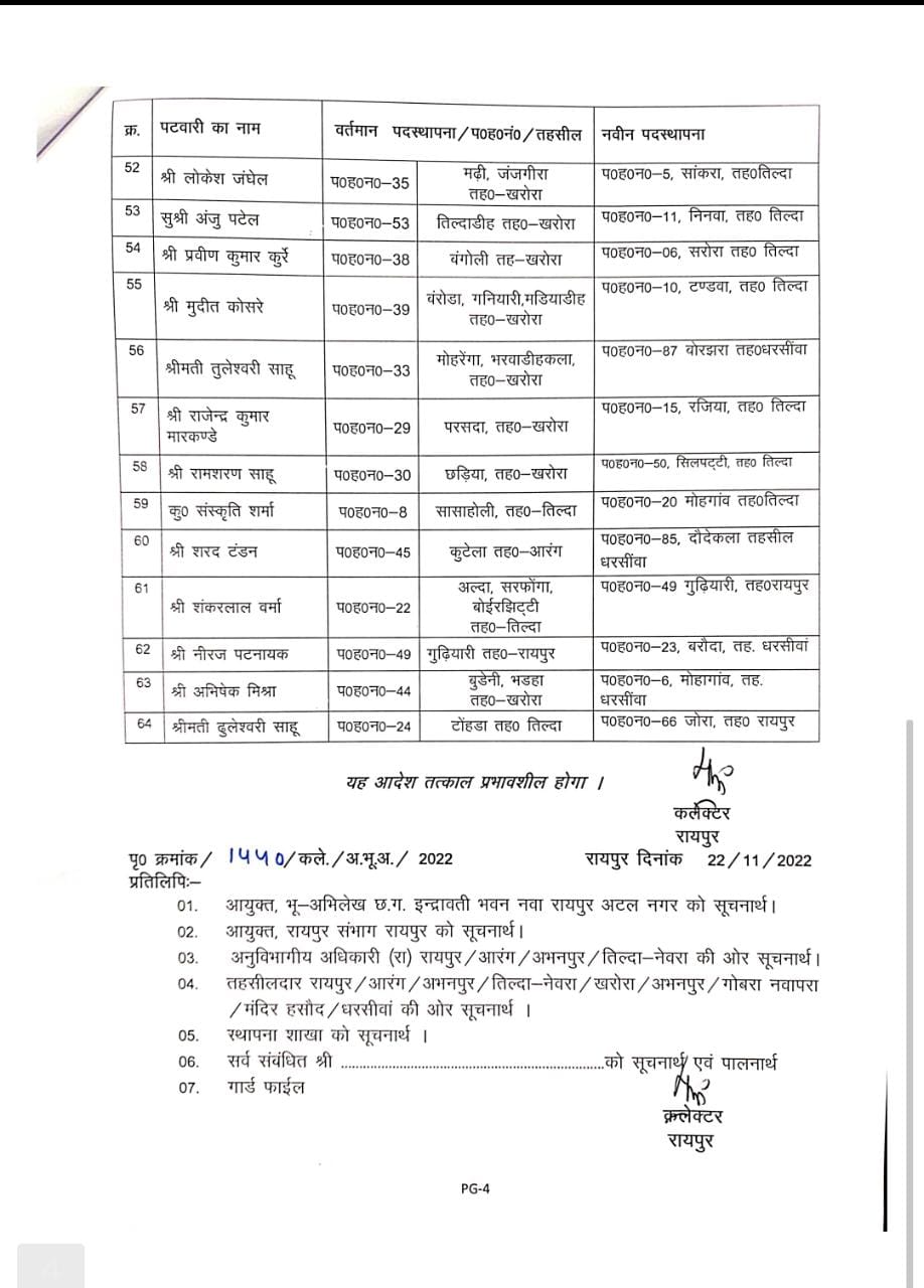 बड़ी संख्या में पटवारियों का तबादला, लम्बे समय से एक ही जगह थे पदस्थ : Raipur Collector issued transfer order of 64 Patwaris of the district