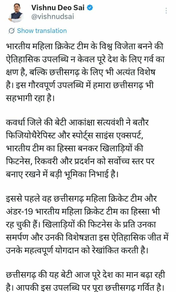 इसको लेकर सीएम ने ट्वीट कर लिखा है कि ”भारतीय महिला क्रिकेट टीम के विश्व विजेता बनने की ऐतिहासिक उपलब्धि न केवल पूरे देश के लिए गर्व का क्षण है, बल्कि छत्तीसगढ़ के लिए भी अत्यंत विशेष है। इस गौरवपूर्ण उपलब्धि में हमारा छत्तीसगढ़ भी सहभागी रहा है। कवर्धा जिले की बेटी आकांक्षा सत्यवंशी ने बतौर फिजियोथैरेपिस्ट और स्पोर्ट्स साइंस एक्सपर्ट, भारतीय टीम का हिस्सा बनकर खिलाड़ियों की फिटनेस, रिकवरी और प्रदर्शन को सर्वोच्च स्तर पर बनाए रखने में बड़ी भूमिका निभाई है।