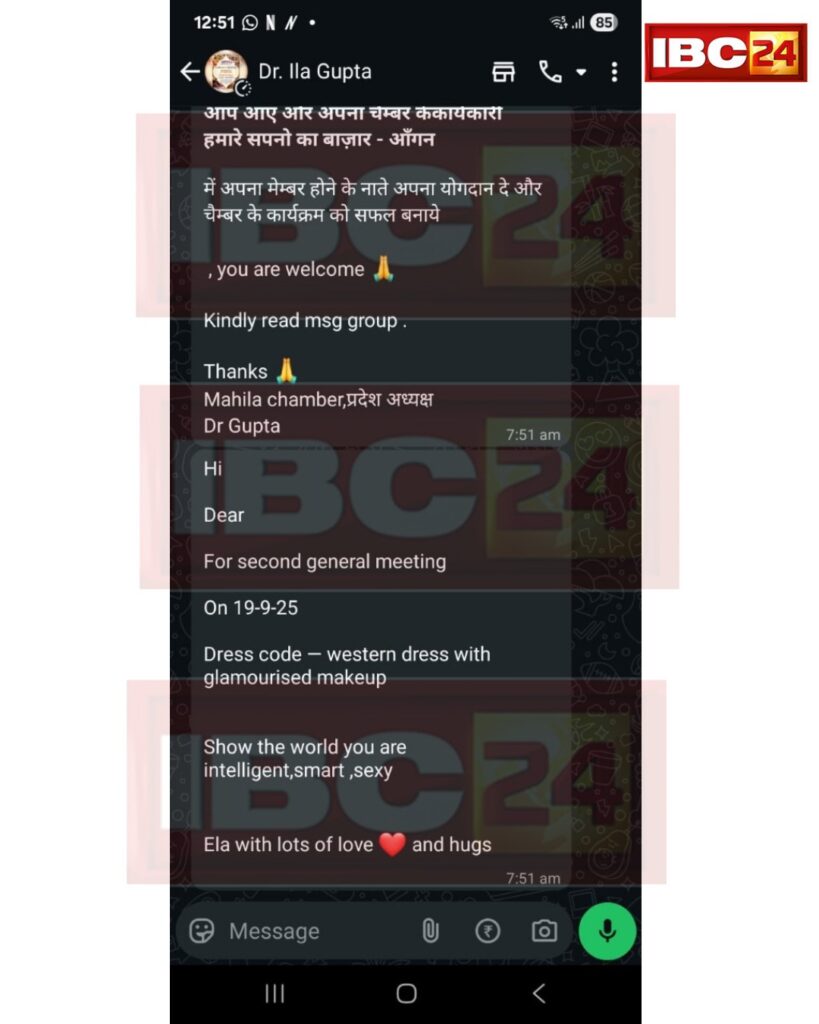 बता दें कि 19 तारीख को महिला चैंबर ऑफ़ कॉमर्स की बैठक होगी। बैठक में महिलाएं ग्लैमरस मेकअप करके आए…. वेस्टर्न कपड़े पहन कर आए… और दुनिया को बताएं कि वह कितनी सेक्सी है….यह मैसेज छत्तीसगढ़ महिला चेंबर ऑफ कॉमर्स की अध्यक्ष डॉक्टर इला गुप्ता की ओर से अपनी साथी महिलाओं को भेजे गए थे। सवाल तब हुआ जब यह मैसेज सोशल मीडिया पर वायरल हो गया। राज्य महिला आयोग की अध्यक्ष डॉक्टर किरणमयी नायक ने इस पर कड़ी आपत्ति जताते हुए इसे महिलाओं का अपमान बताया और इसकी भाषा को आपत्तिजनक भी कहा है।