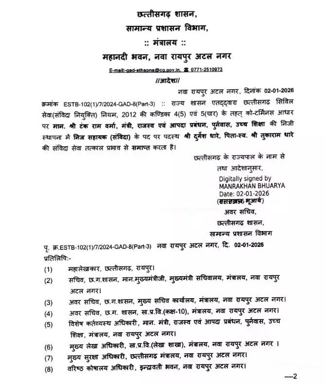 सामान्य प्रशासन विभाग द्वारा जारी आदेश में लिखा गया कि क्रमांक ESTB 102 (1)/7/2024-GAD-8 (Part-3) राज्य शासन एतद्द्वारा छत्तीसगढ़ सिविल सेवा ( संविदा नियुक्ति) नियम, 2012 की कण्डिका 4 (5) एवं 5 (चार) के तहत् को टर्मिनस आधार पर मान. टंक राम वर्मा, मंत्री, राजस्व एवं आपदा प्रबंधन, पुर्नवास, उच्च शिक्षा की निजी स्थापना में निज सहायक (संविदा) के पद पर पदस्थ दुर्गेश धारे, पिता स्व. तुकाराम धारे की संविदा सेवा तत्काल प्रभाव से समाप्त करता है।